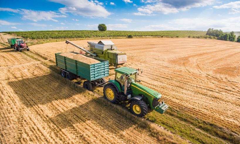 Combine Harvester Pouring Grain into Trailer Towed by Tractor