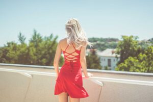 Young Blonde Woman Looking Around on Terrace