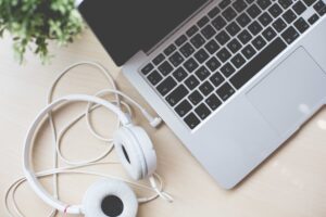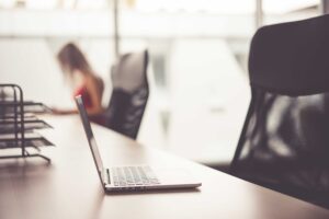 Laptop on Wooden Desk in Office Open Space